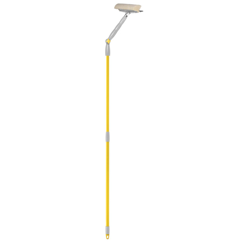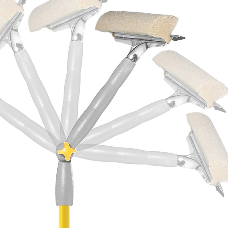 Система миття вікон із губкою, гумовою поворотною основою та телескопічною рукояткою. Рукоятка з ергономічною рукояткою та міцною металевою конструкцією, яку можна використовувати окремо. Завдяки шарніру може мити важкодоступні вікна, навіть горизонтальні. Не залишає смуги на склі.