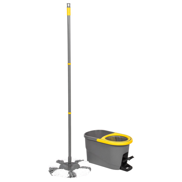 Швабра для миття підлоги в комплекті з відром з педаллю для віджиму, віджим з нержавіючої сталі, ручкою і мопом з мікрофібри, який можна знімати і прати. Швидко сохне, можна прати і сушити. Швабру можна без зусиль віджати, просто натиснувши на педаль ногою. Ідеально підходить для всіх типів підлог.