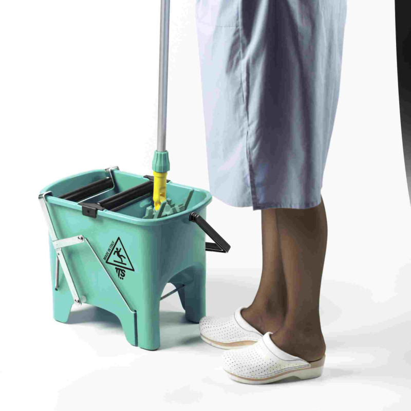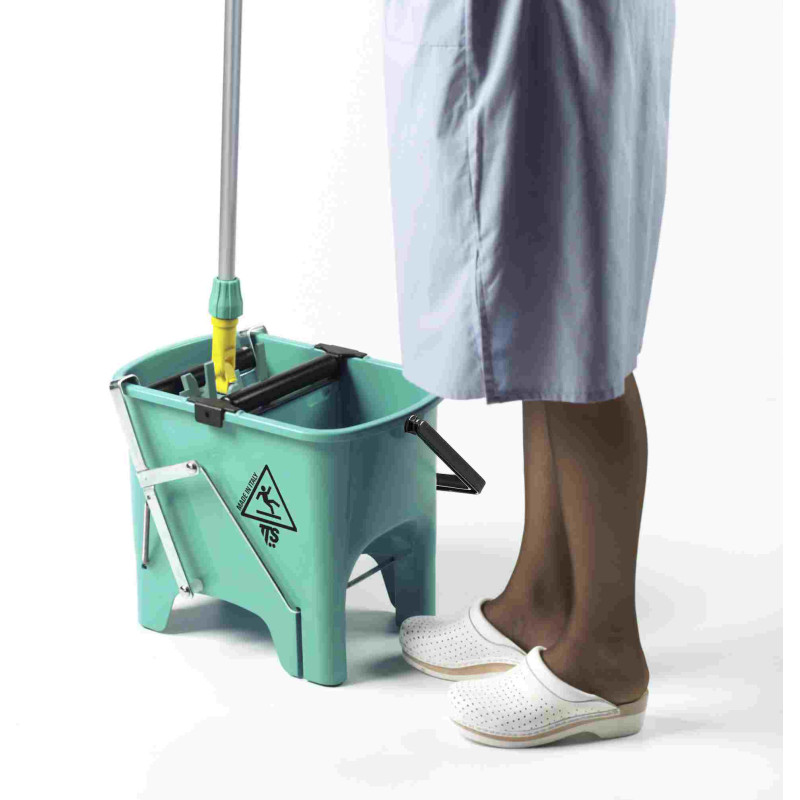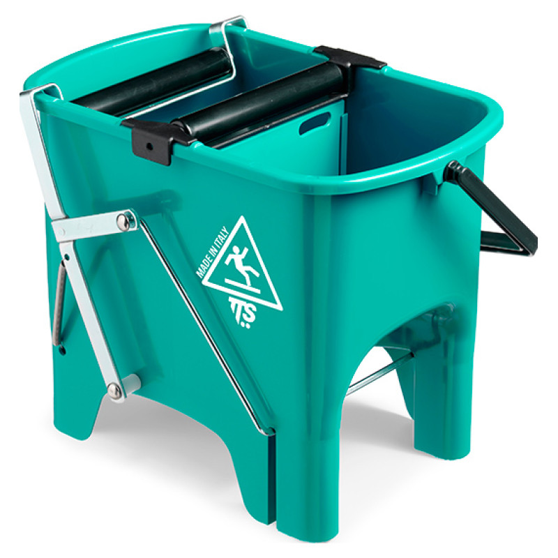 Подвійне поліпропіленове відро для роздільного використання води для полоскання і мийного розчину об`ємом 15 л. До комплекту входить роликовий віджим і педаль. Поліпропіленова ручка для перенесення відра.