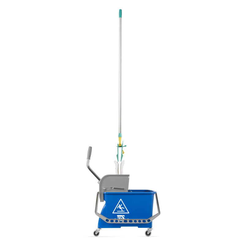 Відро подвійне зі з`ємним роздільником з поліпропілену загальним об`ємом 20л. Одна ручка для переносу відра, колеса діаметром 50 мм і віджимом Flat wringer. Ідеально підходить для професійного прибирання невеликих приміщень. Підходить для віджиму мопів таких систем: Uni System / Wet System / Pockety/ Blik & Wet/ Disinfection