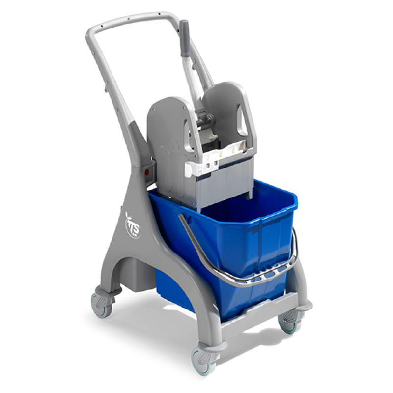 Візок поліпропіленовий з "U"- подібною поліпропіленовою рукояткою сірого кольору і базою сірого кольору, оснащена відром 25 л, віджимом TEC, має чотири колеса Ø80 мм з бамперами. Позаду відра невеликий простір для розміщення пляшок і флаконів з мийними засобами. За допомогою тримача мішка арт. S070100 можна використовувати мішок для сміття 50л з поліестру. Мішок у комплект не входить.