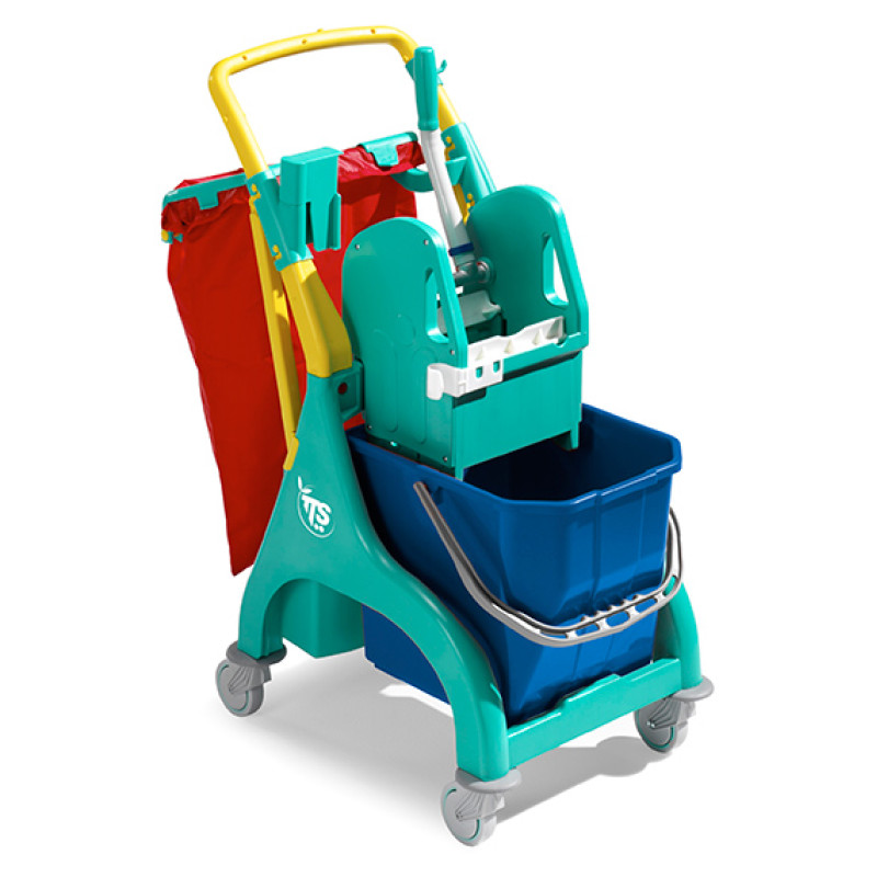 Поліпропіленовий візок з одним відром на 25л, віджимом TEC і пластиковою "U"-подібною рукояткою на пластикових колесах Ø80мм арт. 3489 і бамперами арт. 3557. Мішок у комплект не входить. Рукоятку жовтого кольору можна замінити на рукоятку сірого кольору арт. 3311.