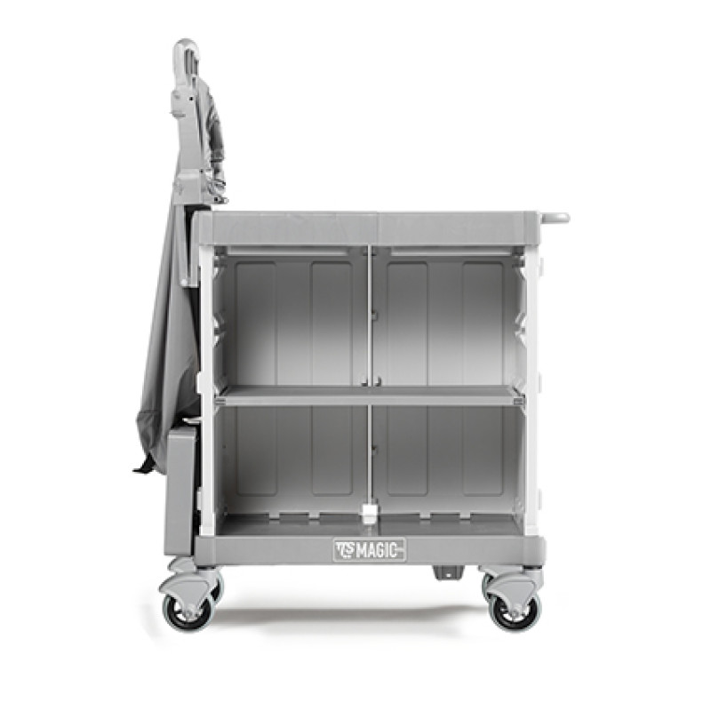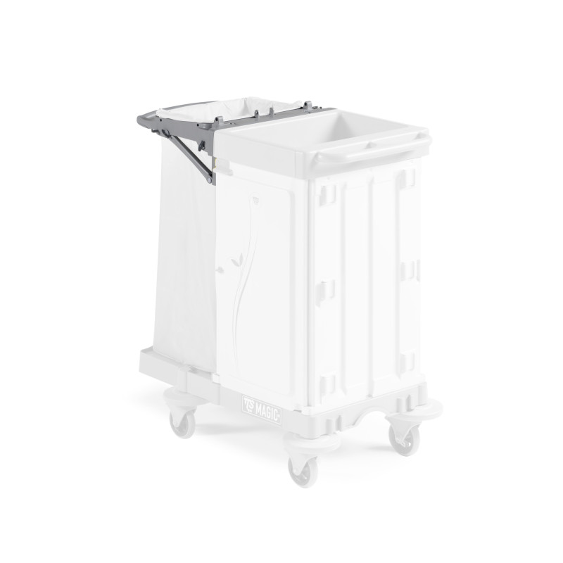 Сірий пластмасовий тримач мішка 120л для візків Magic Hotel дозволяє складати пустий мішок для сміття і тримач під мішок для більш компактного переміщення візка вузькими місцями. До комплекта входить кріплення.
