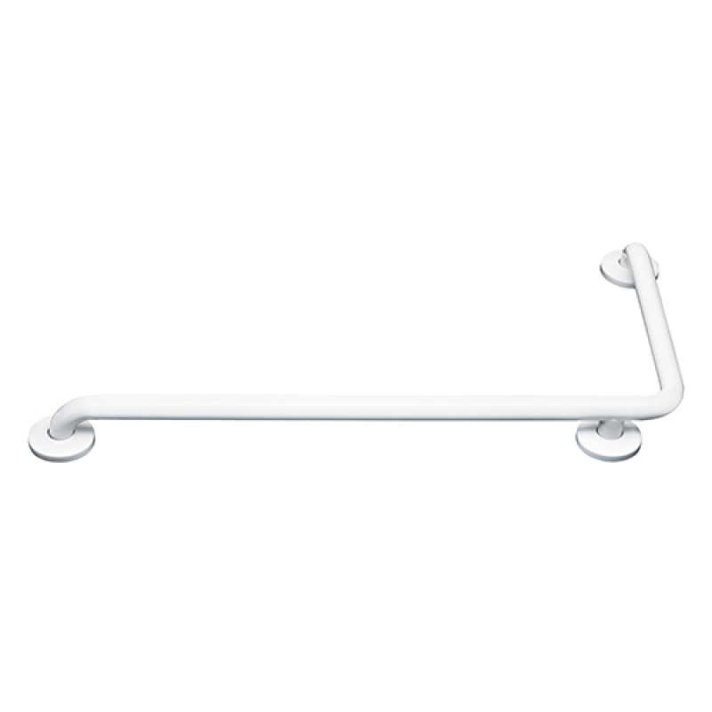Поручень для осіб з інвалідністю (Г-подібний) з кутом 90° правосторонній. Відмінне рішення що допомагає людям з порушеннями опорно-рухового апарату обходитись без сторонньої допомоги і забезпечує необхідну підтримку при ходьбі, стоянні і сидінні. Виготовлений в антивандальному виконанні. Матеріал - метал пофарбований у білий колір епоксидною фарбою.