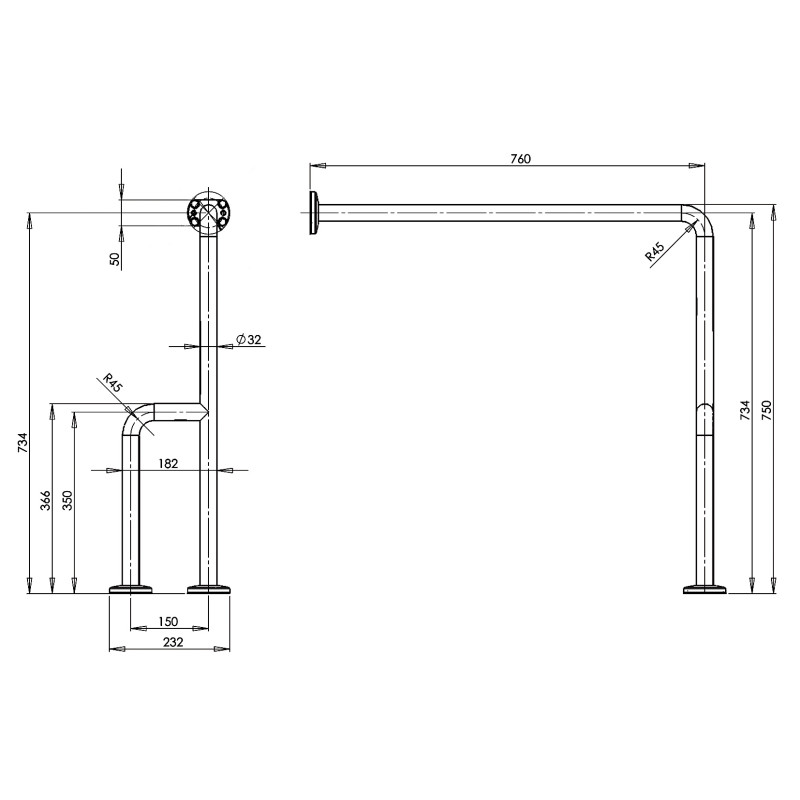 Поручень для осіб з інвалідністю (кутовий правий) встановлюється праворуч від раковини або унітаза. Відмінне рішення, що допомагає людям з порушеннями опорно-рухового апарату обходитись без сторонньої допомоги і забезпечує необхідну підтримку при ходьбі, стоянні і сидінні. Виготовлений в антивандальному виконанні. Матеріал - нержавіюча сталь AISI 304 із сатинованим оздобленням.