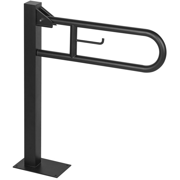 Поручень для осіб з інвалідністю (вертикальний) відкидний встановлюється в громадських ванних і туалетних кімнатах. Встановлення праворуч або ліворуч від унітаза дозволяє розташувати поручень максимально зручно на потрібній відстані від унітаза. Виготовлений в антивандальному виконанні. Матеріал - сталь пофарбована у чорний колір епоксидною фарбою. Цей поручень можна перемістити з вертикального положення в горизонтальне вручну. Для цього просто припідніміть поручень і опустіть в горизонтальне положення до спрацювання блокування. Відкидний захват 738 мм з тримачем туалетного паперу. Підіймається на 90°. Одна з переваг - міцна конструкція.