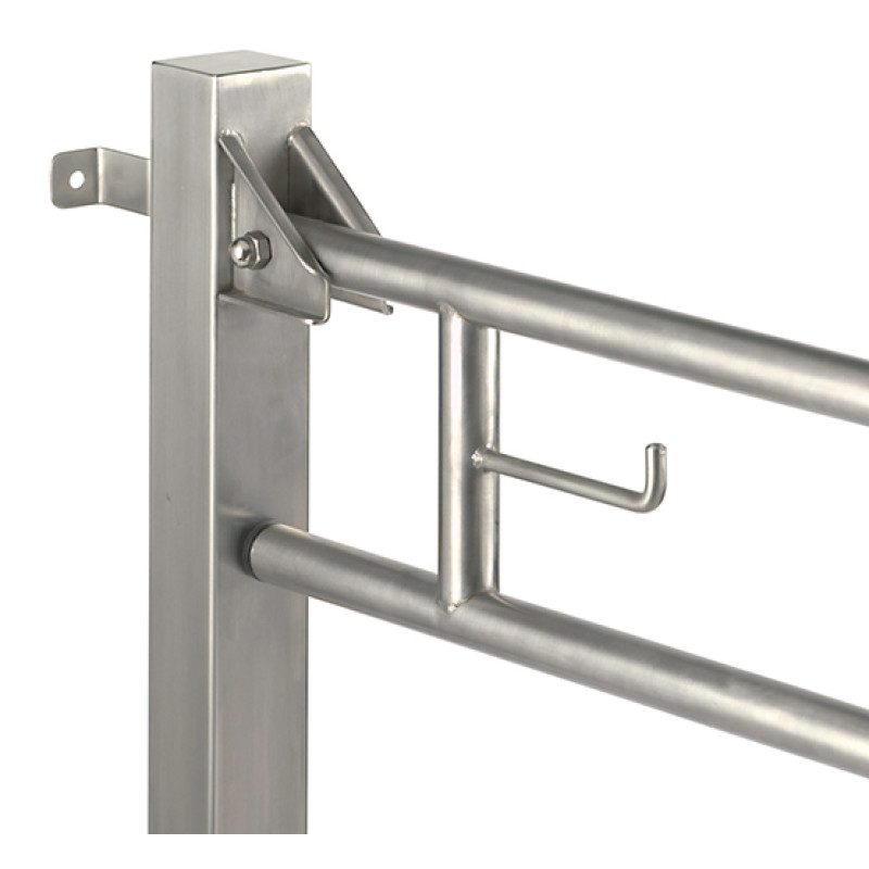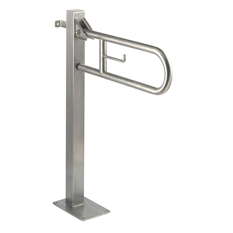 Поручень для осіб з інвалідністю (вертикальний) відкидний встановлюється в громадських ванних і туалетних кімнатах. Встановлення праворуч або ліворуч від унітаза дозволяє розташувати поручень максимально зручно на потрібній відстані від унітаза. Виготовлений в антивандальному виконанні. Матеріал - нержавіюча сталь AISI 304 із сатинованим оздобленням. Цей поручень можна перемістити з вертикального положення в горизонтальне вручну. Для цього просто припідніміть поручень і опустіть в горизонтальне положення до спрацювання блокування. Відкидний захват 738 мм з тримачем туалетного паперу. Підіймається на 90°. Одна з переваг - міцна конструкція.