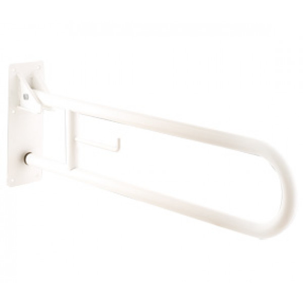 Поручень для осіб з інвалідністю (відкидний) підходить для встановлення у громадських ванних і туалетних кімнатах. Відмінне рішення що допомагає людям з порушеннями опорно-рухового апарату обходитись без сторонньої допомоги і забезпечує необхідну підтримку при ходьбі, стоянні і сидінні. Матеріал - нержавіюча сталь пофарбована у білий колір епоксидною фарбою. Вирізняється високою міцністю і антикорозійними властивостями. Цей поручень можна перемістити з вертикального положення в горизонтальне вручну. Щоб перемістити поручень з горизонтального положення у вертикальне просто припідніміть поручень і опустіть у горизонтальне положення, щоб спрацювало блокування. Відкидний захват 738 мм з тримачем туалетного паперу. Підіймається на 90°.