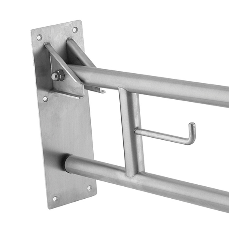 Поручень для осіб з інвалідністю (відкидний) підходить для встановлення у громадських ванних і туалетних кімнатах. Відмінне рішення що допомагає людям з порушеннями опорно-рухового апарату обходитись без сторонньої допомоги і забезпечує необхідну підтримку при ходьбі, стоянні і сидінні. Матеріал - нержавіюча сталь AISI 304 із сатинованим оздобленням. Вирізняється високою міцністю і антикорозійними властивостями. Цей поручень можна перемістити з вертикального положення в горизонтальне вручну. Щоб перемістити поручень з горизонтального положення у вертикальне просто припідніміть поручень і опустіть у горизонтальне положення, щоб спрацювало блокування. Відкидний захват 738 мм з тримачем туалетного паперу. Підіймається на 90°.