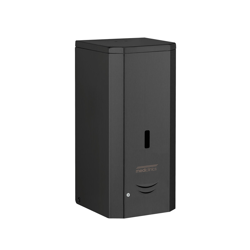Дозатор для дезінфікуючого засобу ємкістю 1л, виготовлений з нержавіючої сталі AISI 304 товщиною 0,8 мм, пофарбований чорною епоксидною фарбою, встановлюється безпосередньо на стіну і автоматично вмикається при піднесенні руки. Працює від 6шт. лужних батарейок типу АА ( в комплект не входять) або з AC-адаптером змінного струму, який НЕ входить в комплект. Ця модель дозатора має функціональний, міцний і модний дизайн, який відповідає новому асортименту аксесуарів для ванних кімнат Mediclinics, що дозволяє цьому диспенсеру ідеально доповнювати будь-який простір.