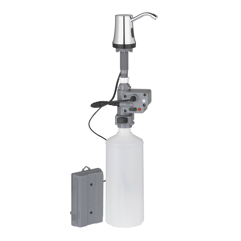 Дозатор сенсорний вбудований розрахований на використання 1,6 л рідкого мила. При піднесенні руки до крану видається порція мила. Добре підходить для громадських санітарних приміщень з високою відвідуваністю, де немає можливості встановити дозатор на стіну. Забезпечує повну гігієнічність та економічність в застосуванні. Одна крапля рідкого мила об`ємом 0,8 мл видається протягом 2-х секунд.