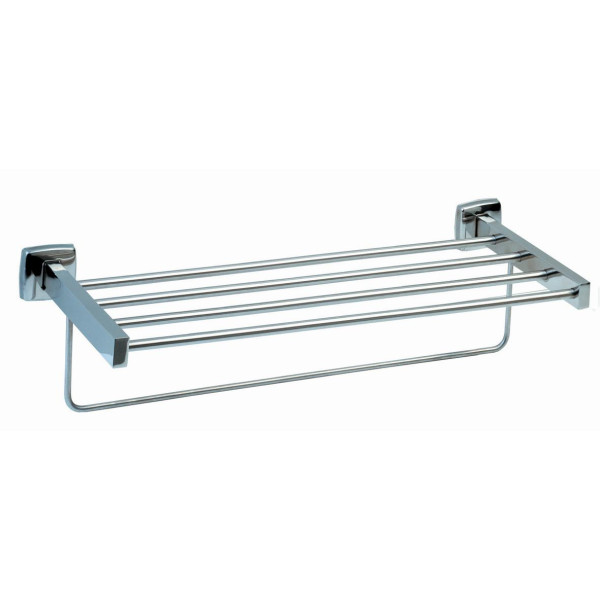 Полиця для текстильних рушників з перекладиною виготовлена з нержавіючої сталі з глянцевим покриттям марки AISI 304 товщиною 0,8 мм, трубки ліаметром 9мм. Підходить для оснащення ванних кімнат в готельних номерах. Не має роз`ємних частин. Сама полиця складається з 4-ти планок, Повністю зварна конструкція. Монтується на стіну за допомогою саморізів, які входять у комплект. Модель підходить для готельного сектору