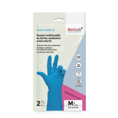 Господарські рукавички для харчової промисловості, сфери громадського харчування та великих торгових мереж. Багаторазові нітрилові харчові рукавички Sensi Food 33, анатомічної форми (праві та ліві), довжиною 33 см. Не містять латексу, захищають від можливих алергічних реакцій, пов'язаних з водорозчинними білками натурального каучукового латексу. Синього кольору. Зовнішня сторона не має валця, з алмазним огранюванням. Перевірено на контакт з харчовими продуктами та дуже ергономічні для тривалого носіння без втоми. Всередині можна прати.