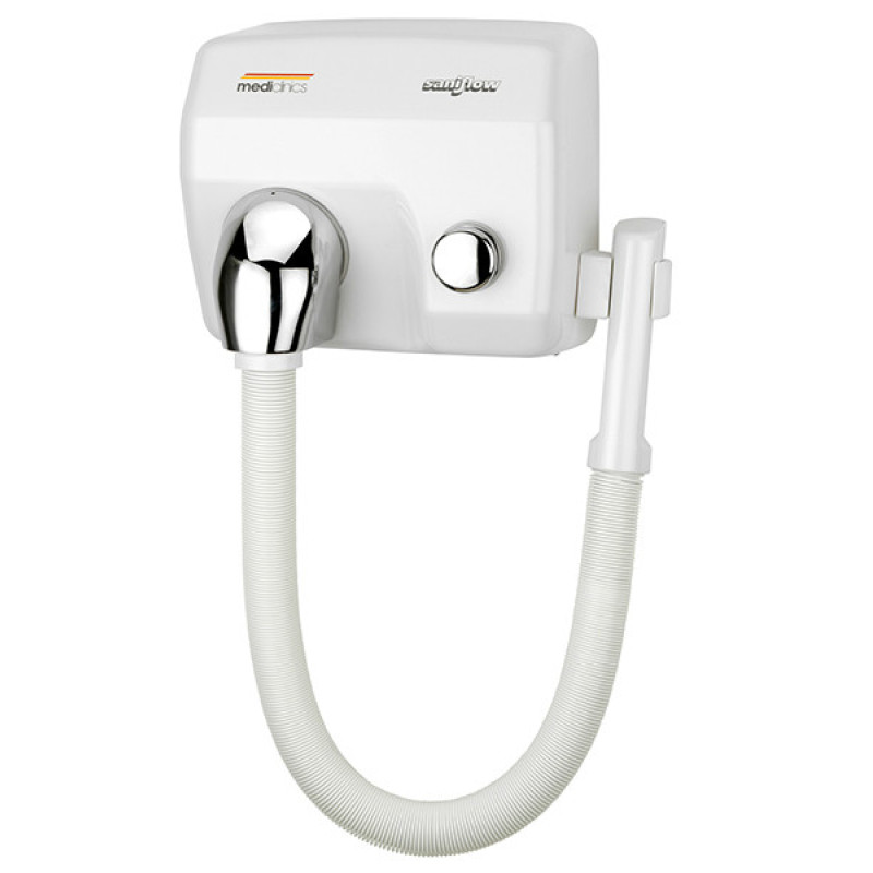 Сушарка для волосся Saniflow® іде в комплекті зі шлангом, який кріпиться до бази. Має високі характеристики, потужні двигуни, лаконічний та практичний дизайн, проста в експлуатації, стійка, економічна і пропонує збалансоване споживання електроенергії. Вмикається сушарка кнопкою, ця модель доступна і без додаткової трубки для того, щоб задіяти більшу кількість потреб. Довжина шлангу - 1000-2500мм, який поміщається в неробочому стані на важіль справа.