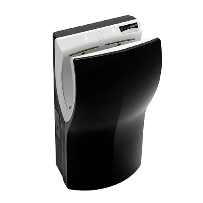 Сушарки для рук Dualflow® Plus автоматичні з інноваційним дизайном у чорному кольорі. Dualflow® Plus є частиною нового покоління сушарок з новою революційною конструкцією, моделі, що забезпечують економію енергії та ультрашвидке висихання. Запобігає потраплянню бризок води на підлогу. Завдяки інноваційній конструкції двигуна, відбувається економія електроенергії до 73 % порівняно з іншими сушарками у своєму класі. Крім того, потужність двигуна є регульованою, з мінімумом 420 Вт і не більше 1100 Вт.