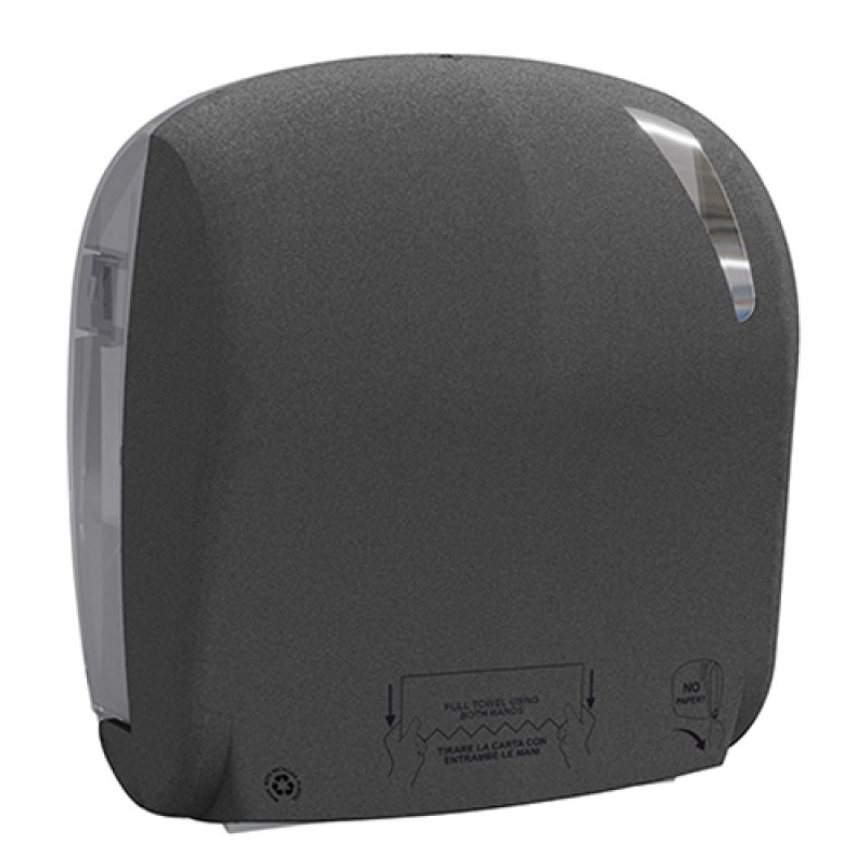 Тримач паперових рулонних рушників автоматичний LINEA SKIN (ручна подача паперу, відрив автоматичний) з вікном огляду на фронтальній стороні тримача. Велика місткість скорочує частоту перезаправок. При витягуванні рушника двома руками рушник обрізається ножем автоматично. Корпус тримача виготовлений з переробленого пластику з покриттям "Stone". Габаритні розміри – 371x330x221 мм. Призначений для паперових рушників у рулонах з діаметром не більше 190 мм без перфорації. Замикається на замок. Підходять рулони висотою до 220 мм.