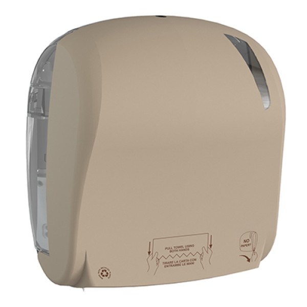Тримач паперових рулонних рушників автоматичний LINEA SKIN (ручна подача паперу, відрив автоматичний) з вікном огляду на фронтальній стороні тримача. Велика місткість скорочує частоту перезаправок. При витягуванні рушника двома руками рушник обрізається ножем автоматично. Корпус тримача виготовлений з переробленого пластику з покриттям "Sand". Габаритні розміри – 371x330x221 мм. Призначений для паперових рушників у рулонах з діаметром не більше 190 мм без перфорації. Замикається на замок. Підходять рулони висотою до 220 мм.