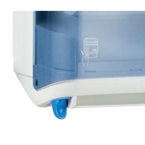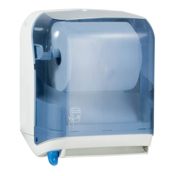 Тримач паперових рулонних рушників з важелем ACQUALBA напівавтоматичний (важільна подача паперу, відрив механічний). Велика місткість скорочує частоту перезаправок. При натисканні на важіль видається рушник розміром, заданим програмою. Корпус тримача виготовлений з удароміцного прозорого пластику. Габаритні розміри – 370x220x320 мм. Призначений для паперових рушників у рулонах з діаметром не більше 190 мм. Замикається на замок.