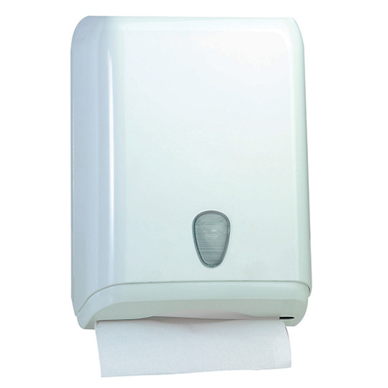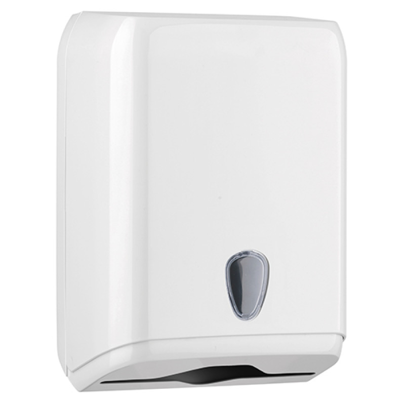 Тримач паперових рушників PRESTIGE має вузький корпус: стильний і компактний. Місткі і надійні, вміщує 2 пачки паперових рушників. Габаритні розміри - 375x280x130 мм. Виготовлений з високоміцного пластику білого кольору. Тип рушників що використовуються – пачки (V-складка). Оглядове вікно у вигляді краплі дозволяє контролювати наявність паперу у диспенсері. Замок розташований зверху для зручності дозаправки витратних матеріалів.