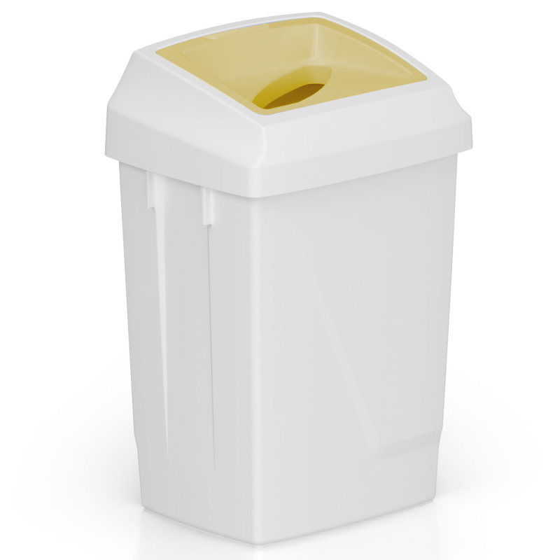 Урна для сміття білого кольору оснащена жовтою кришкою з овальним отвором. Для зручності утилізації сміття верхня частина урни зроблена з`ємною.
