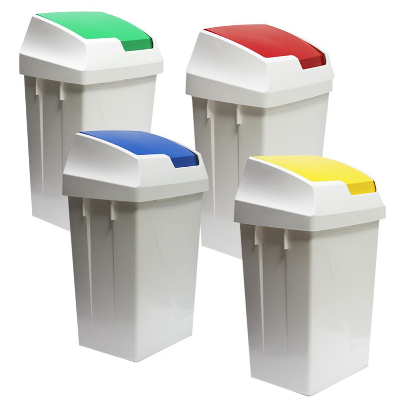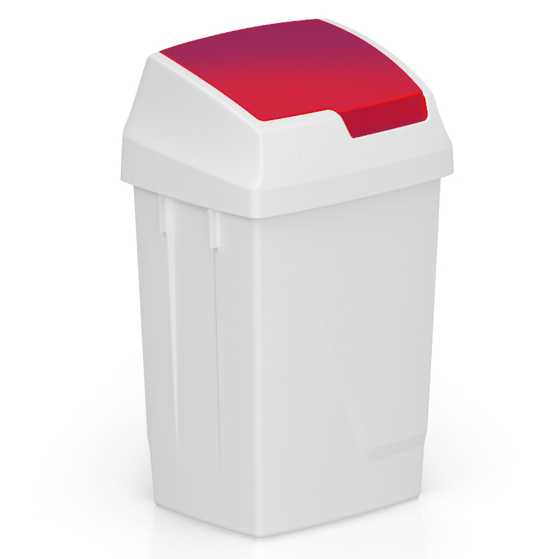 Урна для сміття білого кольору оснащена поворотною кришкою червоного кольору, яка відкривається натиском руки. Для зручності утилізації сміття верхня частина урни зроблена з`ємною. Різнокольорові кришки полегшують сортування сміття.