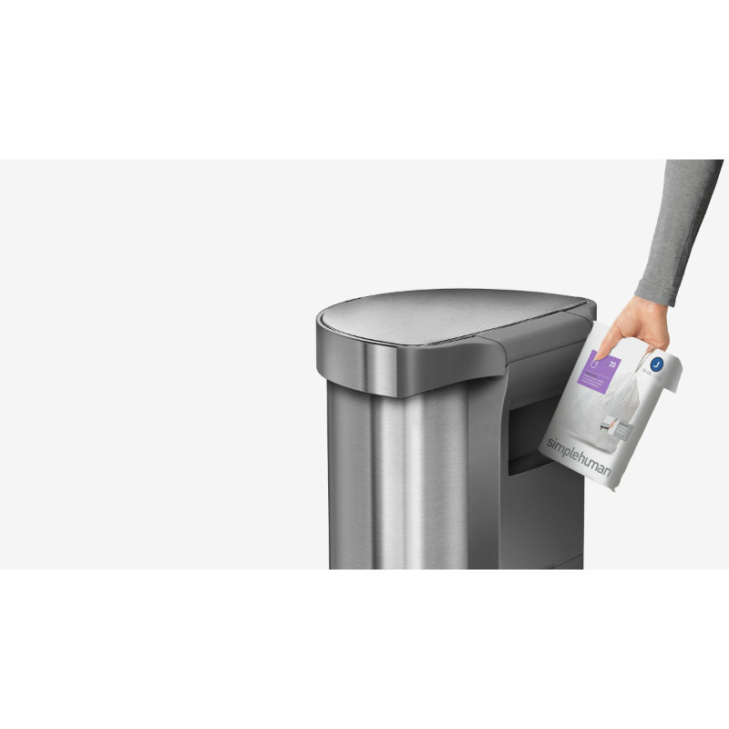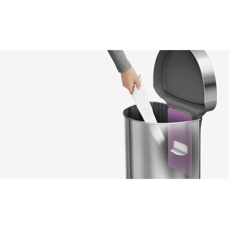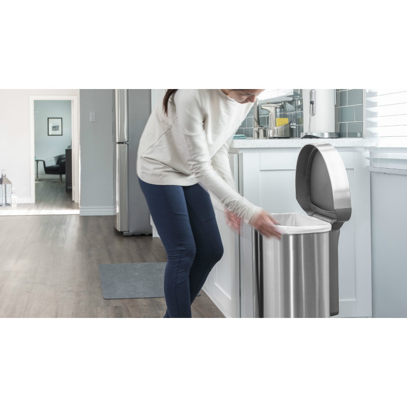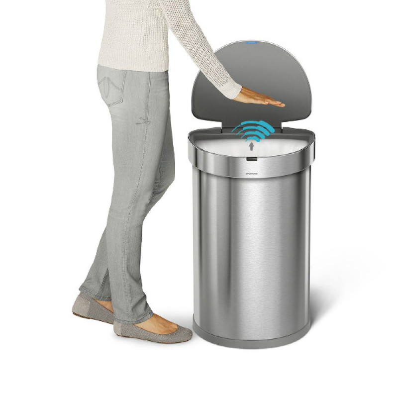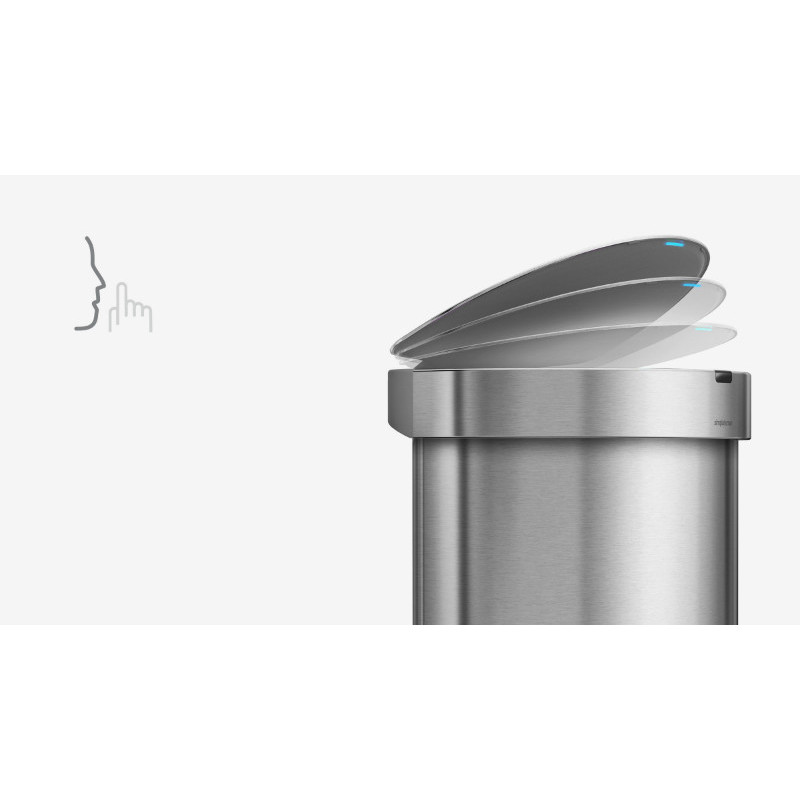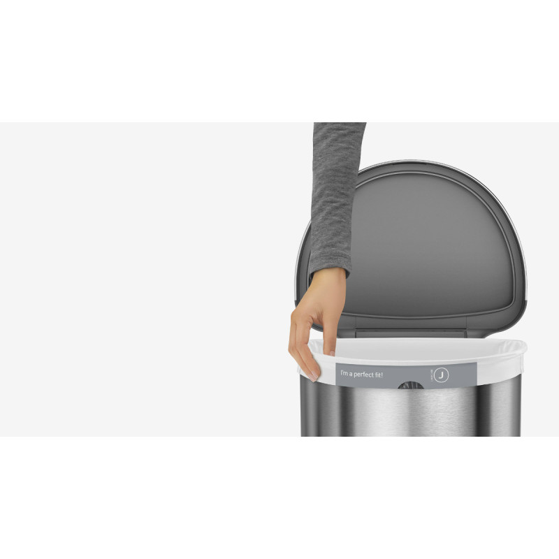 Урна сенсорна має напівкруглу форму, виготовлена з нержавіючої сталі зі спеціальним покриттям, на якому не залишається слідів відбитків пальців. Родзинкою цього відра є кишеня, в якій зберігаються запасні сміттєві мішки для їхньої швидшої заміни. Обід з нержавіючої сталі утримує мішок всередині відра і приховує його. Відсутність внутрішнього відра залишає більше простору для сміття. Інфрачервоний датчик дозволяє швидко і без дотику до відра відкрити кришку. Коли урна не використовується, сенсорна область знаходиться над кришкою, тому вона буде відкриватися тільки тоді, коли Ви підходите близько. Після відкриття область датчика розширюється, тому кришка не закривається, доки Ви не закінчите своє завдання. Запатентована технологія кришки Shox забезпечує плавне і безшумне закриття урни - на 50% тихіше, ніж у конкурентів !!! Працює від 4 AA батарейок. Батарейки та 10 мішків входять в комплект. Підходять мішки з кодом J.