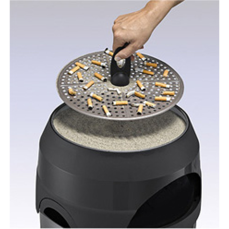 Урна з попільницею призначена для збору недопалків та паперового сміття. Обладнана спеціальною попільницею з адсорбуючим піском (входить в комплект). Зручний контейнер для піску і сітка для видалення сигарет. Бічні отвори призначені для розміщення сміття в урні. Має спеціальний вкладиш для блокування, а також систему для видалення сміття через нижню частину урни.