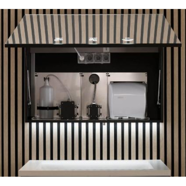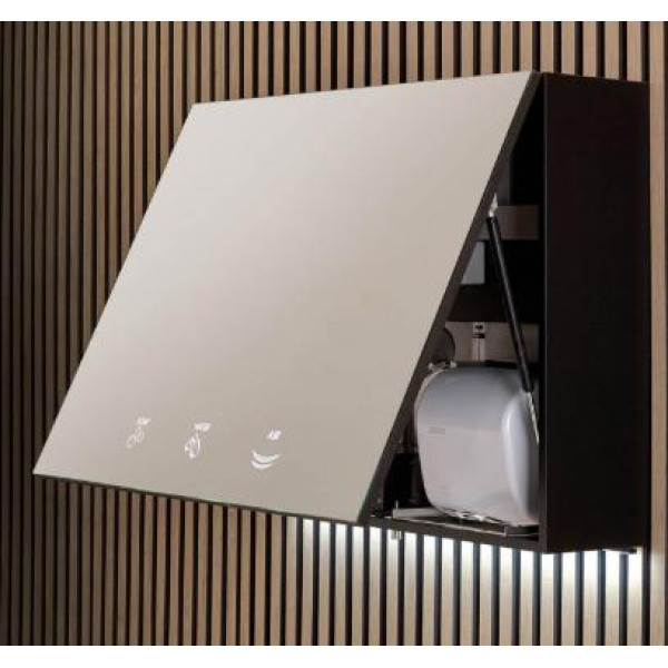Система миття та сушіння рук, інтегрована за дзеркалом, з автоматичним виявленням для економії ресурсів. Прості в установці, модулі регулюються та мають світлодіодні піктограми для інтуїтивно зрозумілого використання. Отримайте мінімалістичні, гігієнічні та організовані туалетні кімнати з цією шафою.