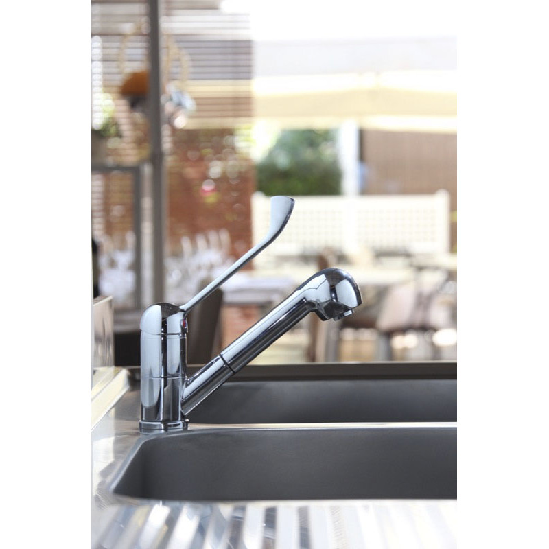 Змішувач з хромованим медичним важелем, поворотним виливом та висувним душем. Розміри та комплектацію дивитись тут: Технічний листок
